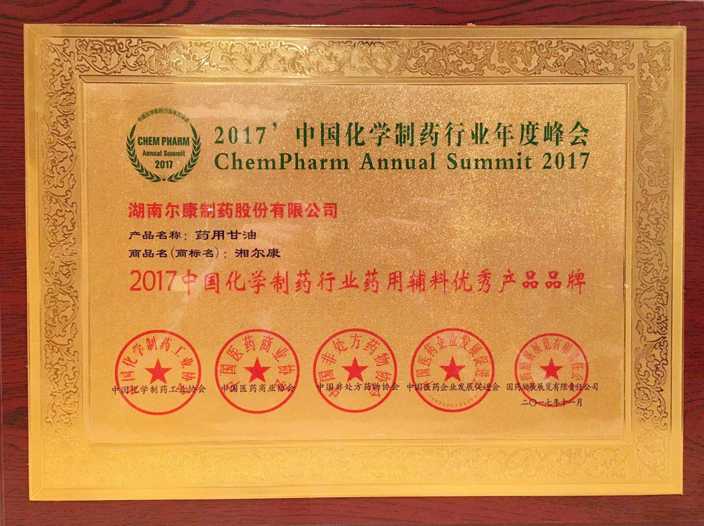本次峰会发布了中国化学制药行业优秀企业及优秀产品品牌榜单,尔康制药荣获“2017中国化学制药行业工业企业综合实力百强”、“2017中国化学制药行业成长型优秀企业品牌”、“2017中国化学制药行业药用辅料优秀企业品牌”、“药用辅料优秀产品品牌(药用甘油和药用丙二醇)”共五项大奖。凭借在药用辅料、原料药领域中的综合实力和品牌影响力,在“中国化学制药行业工业企业综合实力百强”榜单中,尔康制药从2014年第80位晋升至今年第36位,在“2017中国化学制药行业成长型优秀企业品牌”和“2017中国化学制药行业药用辅料优秀企业品牌”品牌榜中双双位列第一。