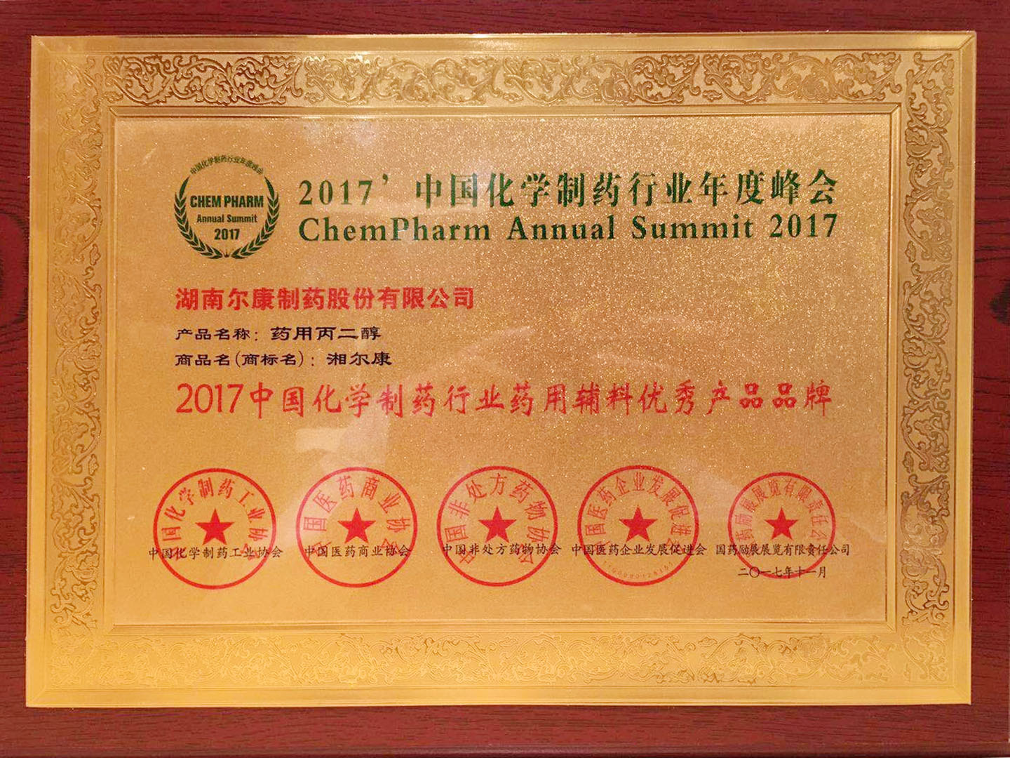 2017中国化药行业药用辅料优秀产品品牌—药用丙二醇