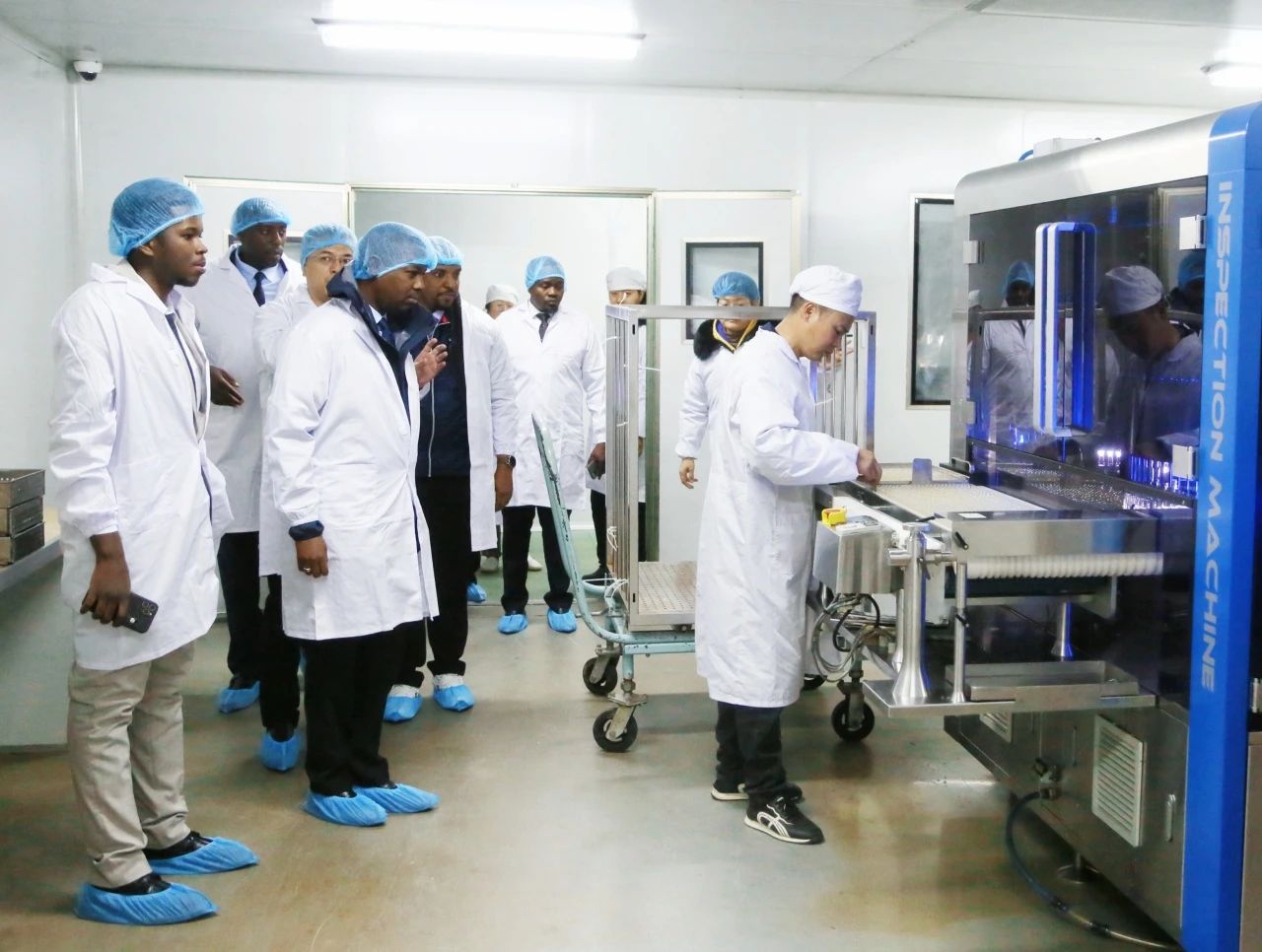 在尔康制药董事长帅放文的陪同下,坦桑尼亚官员一行参观了公司的成品药制剂车间。现代化生产设备和自动化生产流程给他们留下了深刻印象,他们对尔康制药在药品生产、质量控制以及包装流程等方面的严格标准和先进技术表示高度赞赏。