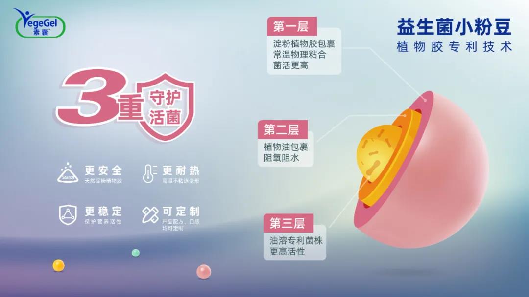 第一重,产品外层使用淀粉植物胶,采用无菌化恒温恒湿物理粘合技术,避免因高温生产带来益生菌活性损伤;