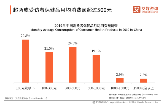 艾媒咨询发布的《2019中国保健品行业消费者行为及认知调查分析》数据显示,我国七成消费者保健品月均消费金额在100元以上,四成消费者会自发购买保健品[1]。相较于美国、日本等发达地区,中国消费者在保健品支出金额方面仍有较大提升空间。