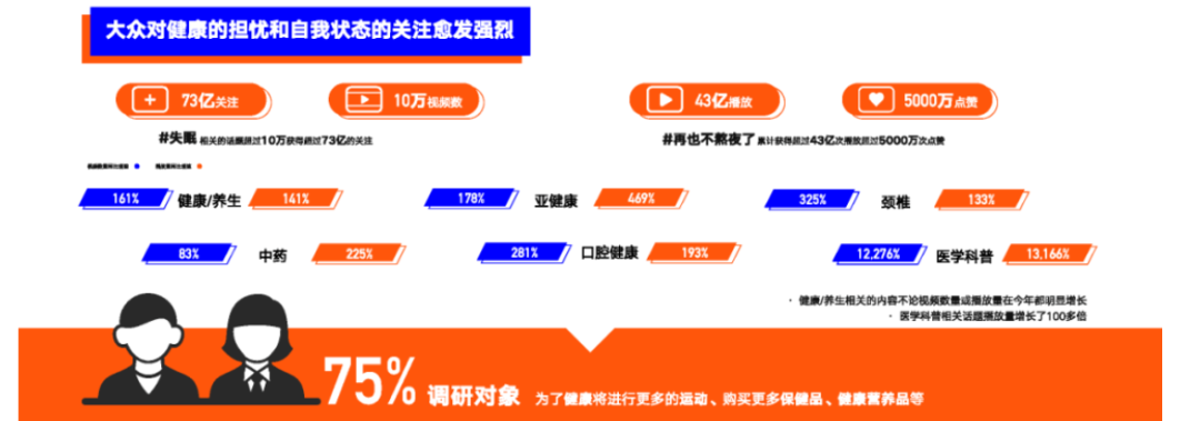 目前,健康中国建设正在全面推进,越来越多的目光投向了营养健康产业。巨量引擎联合尼尔森发布的《2020十大消费新机遇》报告显示,有75%的被调查对象为了健康将进行更多的运动、购买更多的保健品、健康营养品等[3]。